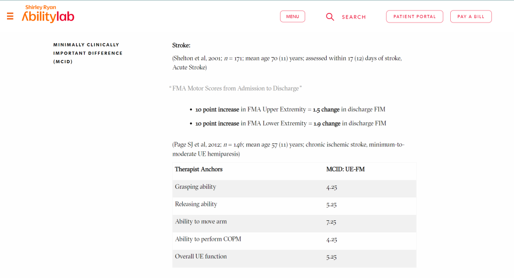 第二种方法是在Shirley Ryan AbilityLab官网(https://www.sralab.org/rehabilitation-measures)上查找。Shirley Ryan AbilityLab 是位于美国芝加哥的一家世界知名的康复医院和研究机构,前身为芝加哥康复研究所(Rehabilitation Institute of Chicago,RIC)。它是全球领先的康复医学中心之一,致力于为患有身体和神经系统功能障碍的患者提供创新性、跨学科的治疗。该网站的官网上提供了常用量表的MCID,可以直接使用。