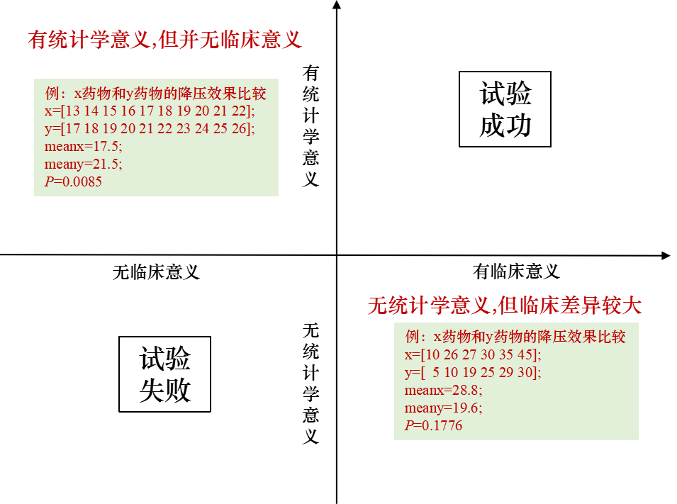 目前大多数临床研究及相关论文以结果统计学差异显著为主要目标,并将这一目标作为研究成功的标准。实际上,统计学具有显著性不代表该结果具有临床意义。从统计学意义和临床意义两个维度去分析一个临床研究的结果,可以得到下图,共四个可能结果,即: